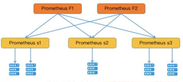 多个Prometheus节点组成两层联邦结构,如图所示,上面一层是联邦节点,负责定时从下面的Prometheus节点获取数据并汇总,部署多个联邦节点是为了实现高可用