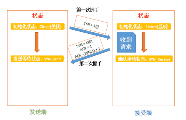 第一次握手:客户端发送请求报文将SYN = j(1)初始化序列号发送给客户端,发送完之后客户端处于SYN_Send状态。