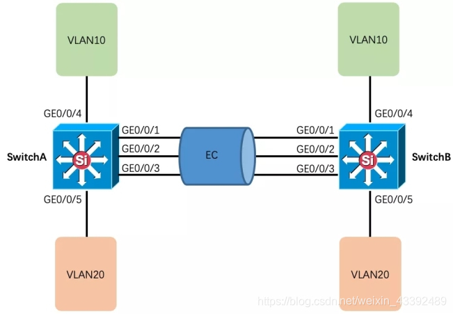 如上图所示,SwitchA和SwitchB通过以太链路分别都连接VLAN10和VLAN20的网络,且SwitchA和SwitchB之间有较大的数据流量。