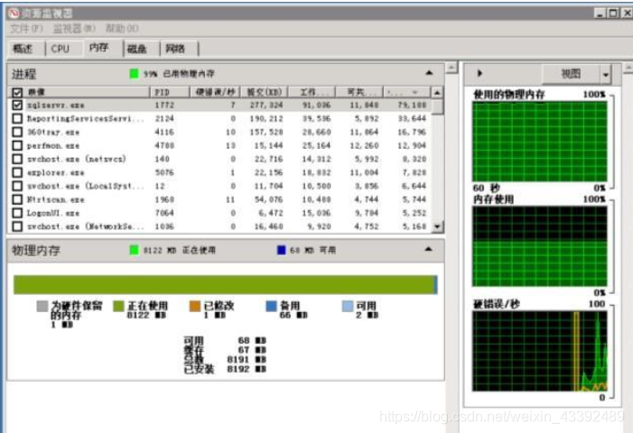 可以发现内存爆满了,而排名第一的正是sqlserver的进程