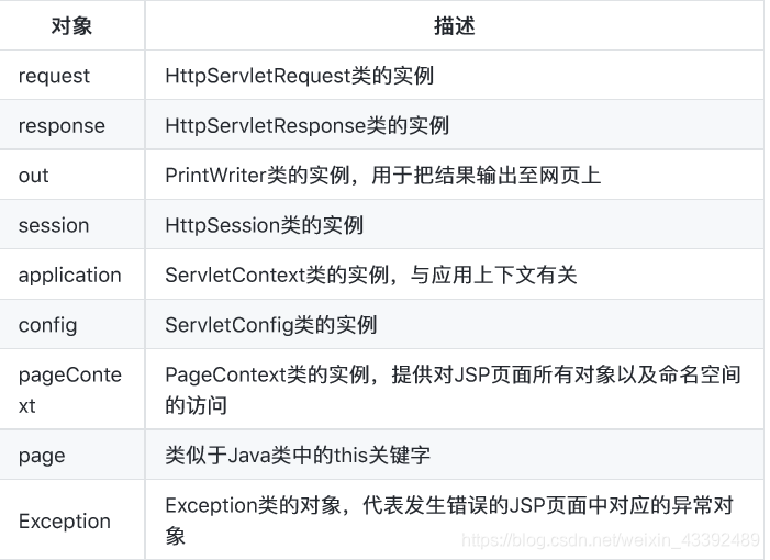 JSP⽀支持九个⾃自动定义的变量量,江湖⼈人称隐含对象。这九个隐含对象的简介⻅见下 表: