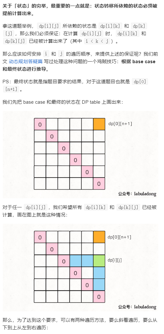 2.关于「状态」的穷举,最重要的一点就是:状态转移所依赖的状态必须被提前计算出来。 通过 初始状态的base case 和最终状态 推导出 i,j 的遍历方向,保证正确的状态转移