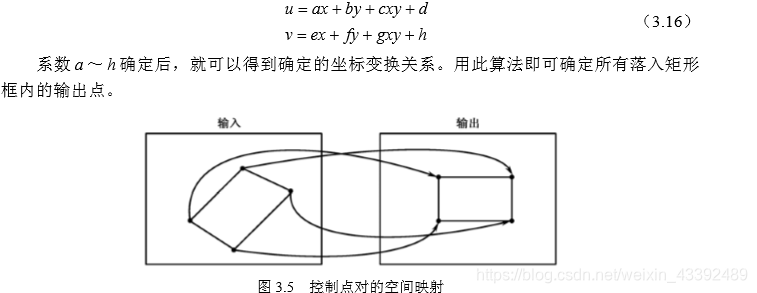 如图 所示,若已知输入图像与输出图像上 4 对对应点对(控制点对)的位移量,则可利用这 4 对 已知控制点对,求解下列坐标变换方程中的系数。