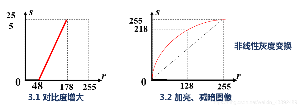 若令 f(x,y) 和 g(x,y) 在任意点( x,y )的灰度级分别为 r 和 s ,则灰度变换函数可简化表示为: