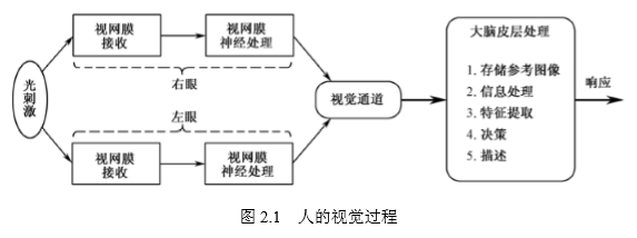 1.人类的视觉感知系统 眼睛中的光接收器主要是视觉细胞,它包括锥状体和杆状体。中央凹(或称中心窝)部 分特别薄,这部分没有杆状体,只密集地分布锥状体。它具有辨别光波波长的能力,因此, 对颜色十分敏感。 视觉是人类的重要功能。视觉过程是一个非常复杂的过程。概括地讲,视觉过程有 3 个 步骤:光学过程、化学过程和神经处理过程。 视觉过程如图 2.1 所示,人的视觉过程就是:当人眼接收光刺激时,首先是条件反射, 由视网膜神经进行处理。随后图像信号通过视觉通道反映到大脑皮层,大脑皮层做出相应的 处理,如存储参考图像、信息处理、特征提取、决策和描述,最终做出响应。