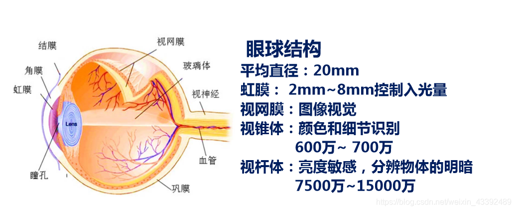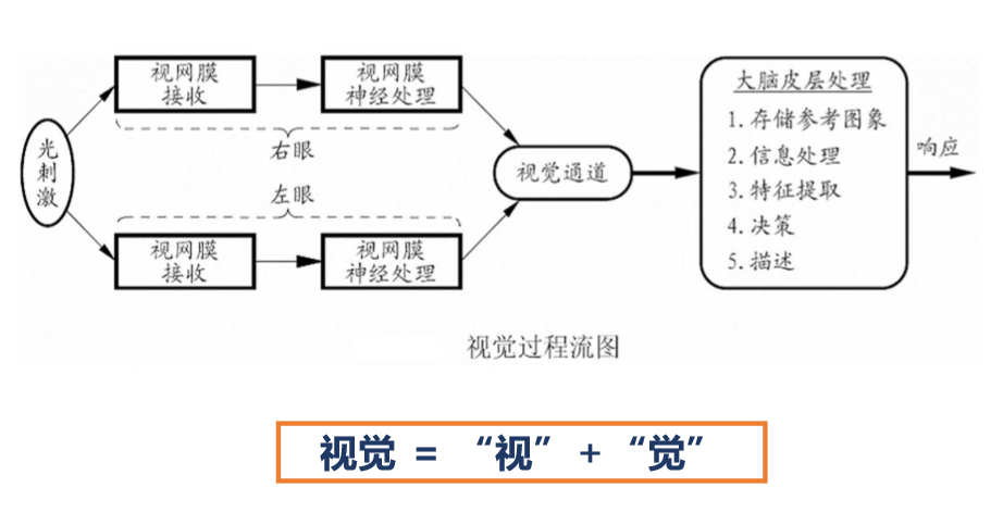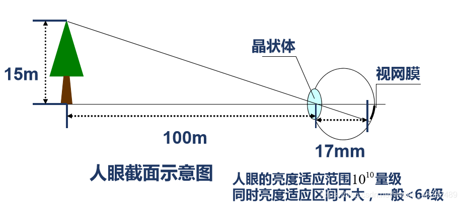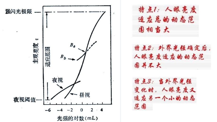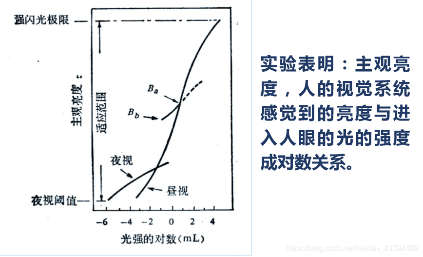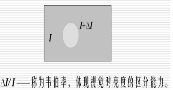 如果△I不够亮,实验者没有感 知上的变化,当△I逐步增强, 感知上发生变化。 如果50%的机会感知亮度变化, 则量△I/I为韦伯率, 小的韦伯率表示可区分强度的 小变化,有较好的亮度区分能 力; 大的韦伯率表示只有大的强度 变化才能区分,有较差的亮度 区分能力