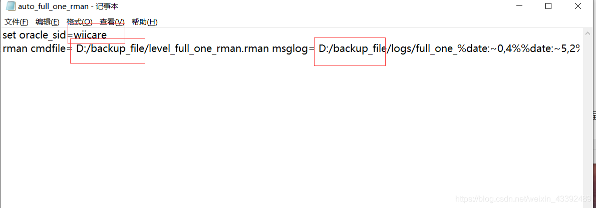 rman cmdfile= D:/backup_file/level_full_one_rman.rman msglog= D:/backup_file/logs/full_one_%date:~0,4%%date:~5,2%%date:~8,2%.log 一个叫level_full_one_rman.rman