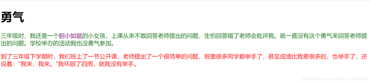 p{color:red;}<p>三年级时,我还是一个<span>胆小如鼠</span>的小女孩。</p>