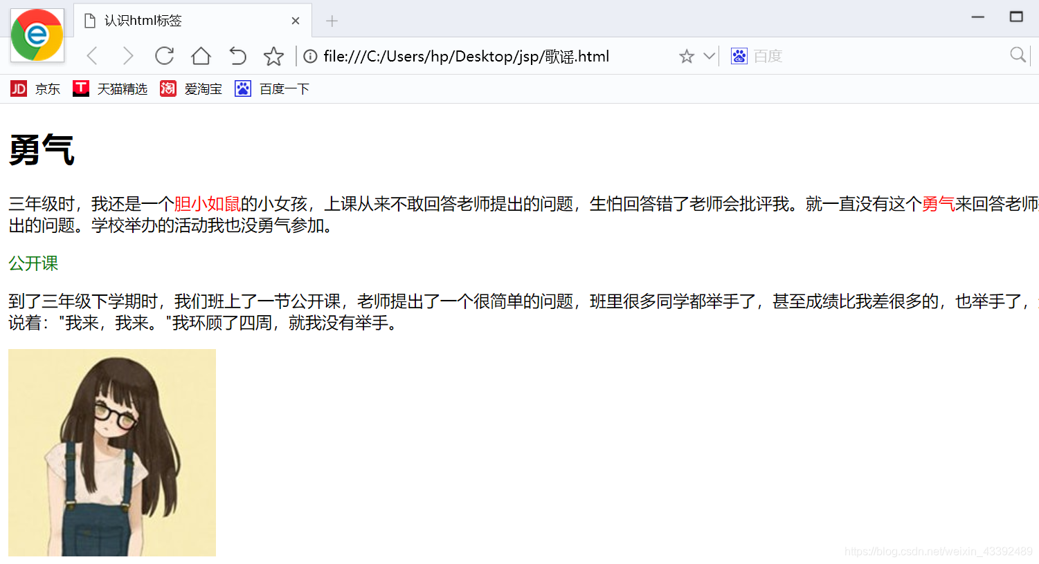 <body><h1>勇气</h1><p>三年级时,我还是一个<span class="stress">胆小如鼠</span>的小女孩,上课从来不敢回答老师提出的问题,生怕回答错了老师会批评我。就一直没有这个<span class="stress">勇气</span>来回答老师提出的问题。学校举办的活动我也没勇气参加。</p><span class="setGreen">公开课</span><p>到了三年级下学期时,我们班上了一节公开课,老师提出了一个很简单的问题,班里很多同学都举手了,甚至成绩比我差很多的,也举手了,还说着:"我来,我来。"我环顾了四周,就我没有举手。</p><img src="http://img.mukewang.com/52b4113500018cf102000200.jpg" >