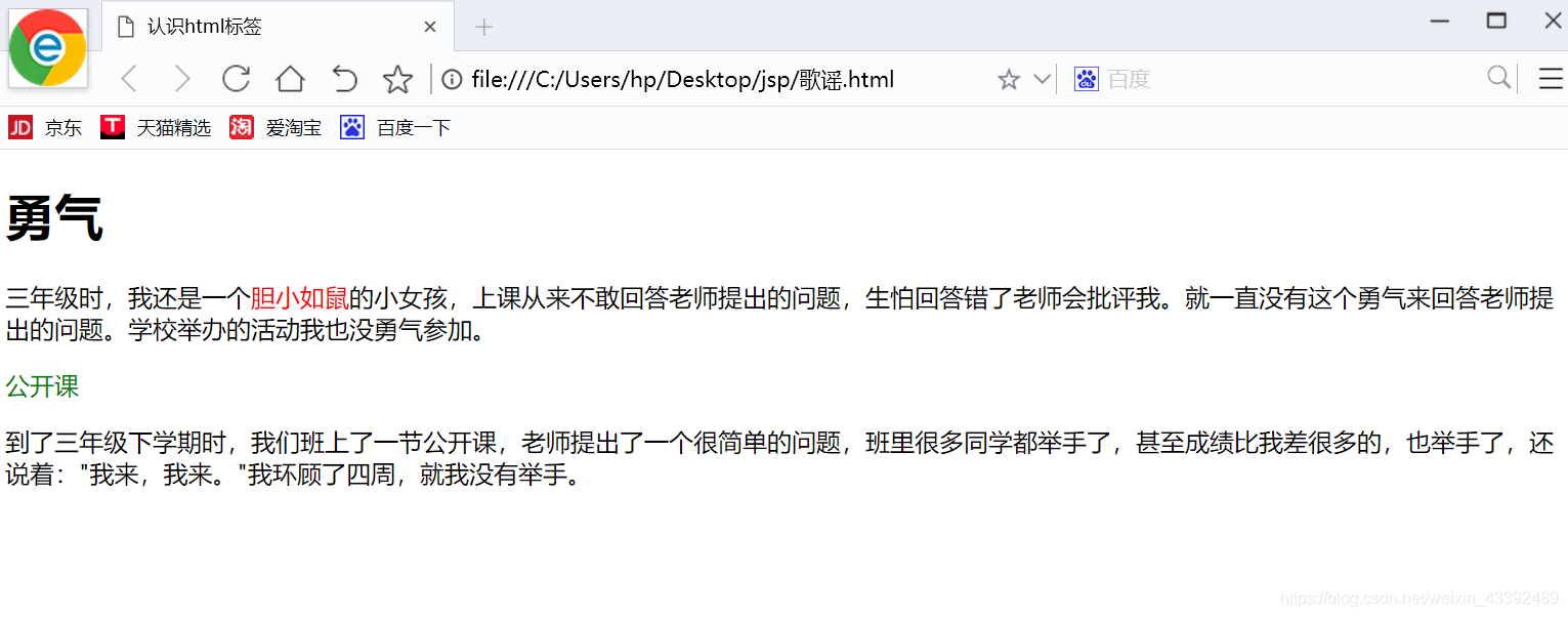 类选择器在css样式编码中是最常用到的,如右侧代码编辑器中的代码:可以实现为“胆小如鼠”、“勇气”字体设置为红色。