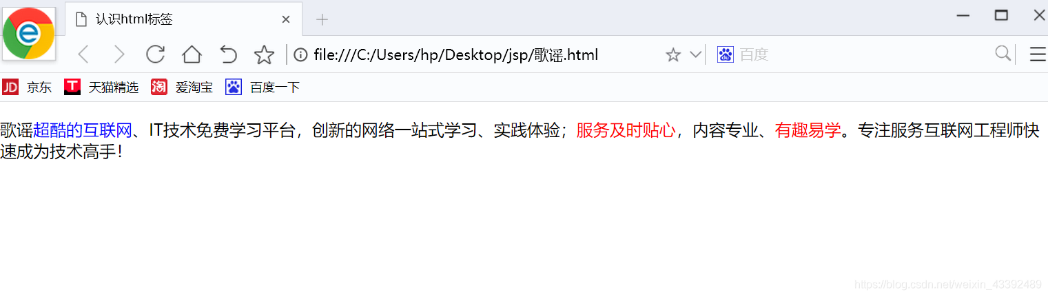 <body><p>歌谣<span style="color:blue">超酷的互联网</span>、IT技术免费学习平台,创新的网络一站式学习、实践体验;<span>服务及时贴心</span>,内容专业、<span>有趣易学</span>。专注服务互联网工程师快速成为技术高手!</p>
