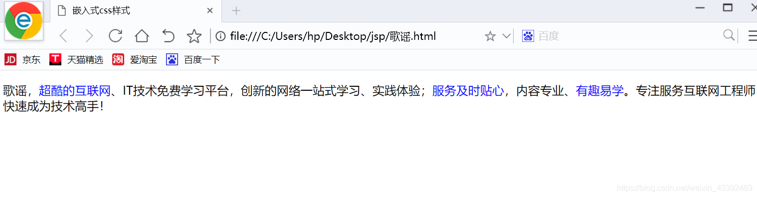 但最终你可以观察到“超酷的互联网”这个短词的文本被设置为了粉色。因为这三种样式是有优先级的,记住他们的优先级:内联式 > 嵌入式 > 外部式