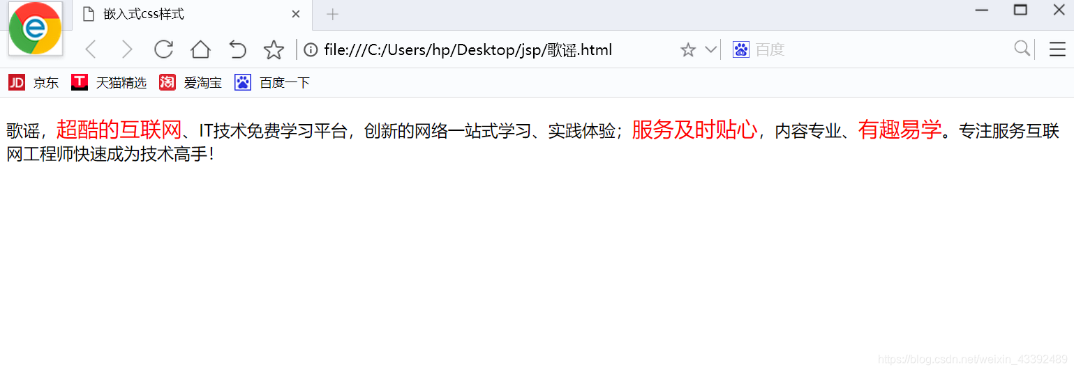 现在有一任务,把右侧编辑器中的“超酷的互联网”、“服务及时贴心”、“有趣易学”这三个短词文字字号修改为18px。如果用上节课我们学习的内联式css样式的方法进行设置将是一件很头疼的事情(为每一个<span>标签加入sytle="font-size:18px"语句),本小节讲解一种新的方法嵌入式css样式来实现这个任务。