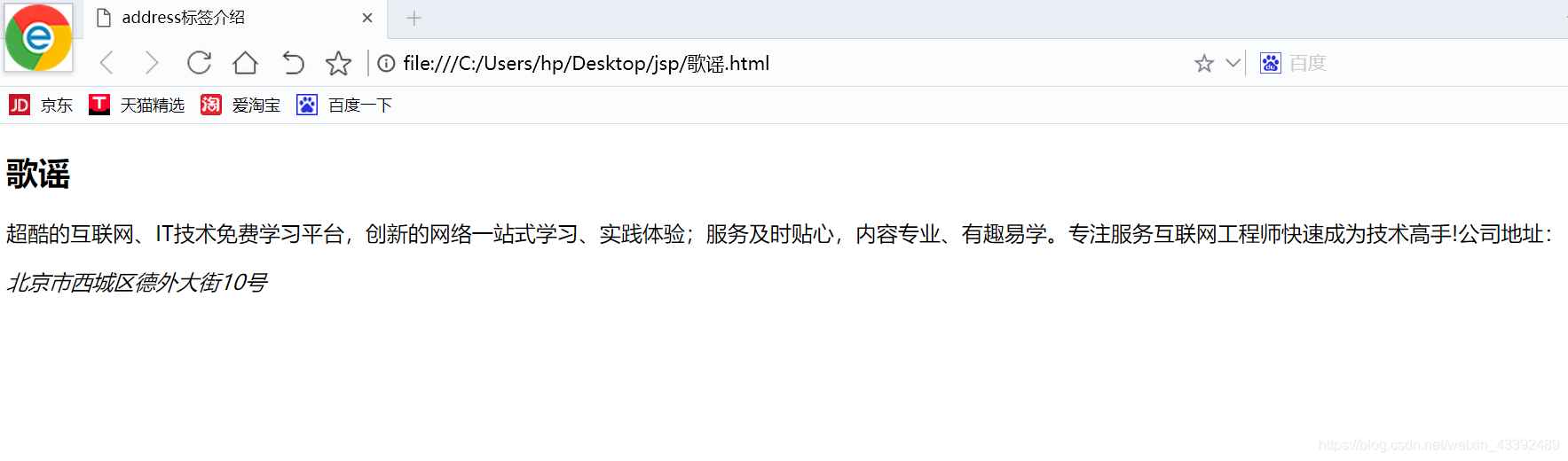 在浏览器上显示的样式为斜体,如果不喜欢斜体,当然可以,可以在后面的课程中使用 css 样式来修改它<address>标签的默认样式。