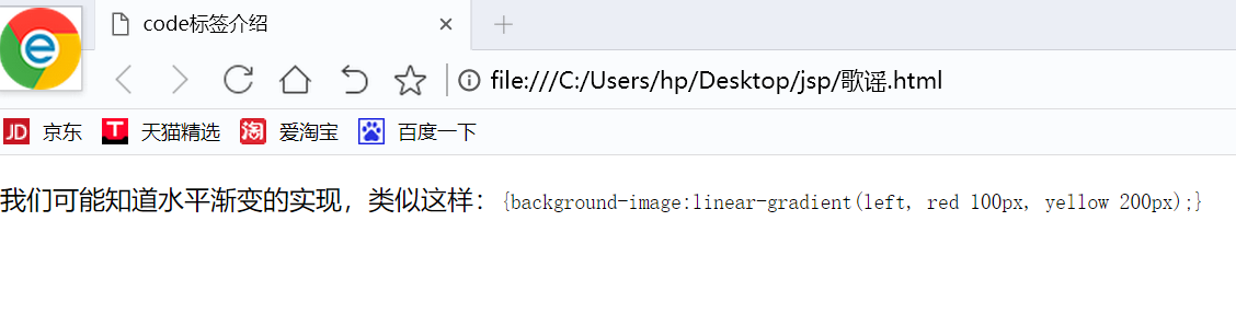 在介绍语言技术的网站中,避免不了在网页中显示一些计算机专业的编程代码,当代码为一行代码时,你就可以使用<code>标签了,如下面例子: