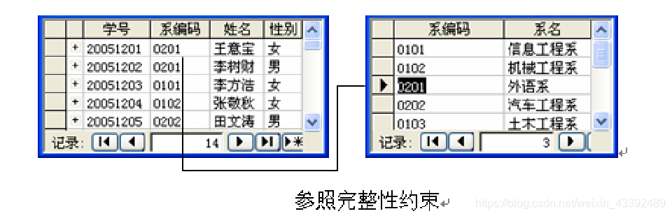 ( 2 )参照完整性约束 参照完整性约束关心的是逻辑相关的表中值与值之间的关系。 假设 X 是一个表 A 的主键,在表 B 中是外键,那么若 K 是表 B 中一个外部键值, 则表 A 中必然存在在 X 上的值为 K 的记录。