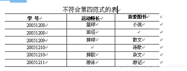 在表中,一个学生可以有多种喜欢的运动,也可以有多类喜欢的图书。这样在 同一表中具有这样两个不相关的列, 与主键存在多对一关系,使得表中存在冗 余现象和不对称情况 , 因为不知道每个人的喜好情况,也就无法知道哪列的值 多,哪列的值少,使得表格中出现了很多不规则的空白。