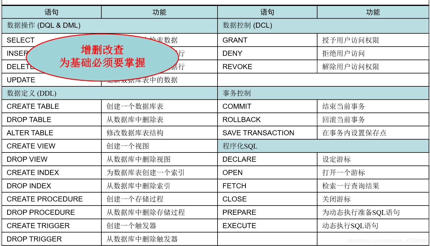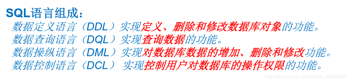 。 SQL 语言的功能包括查询、操纵、 定义和控制,是一个综合的、通用的关系数据库语言,同时又是一种高度非过程化 的语言,只要求用户指出做什么而不需要指出怎么做。