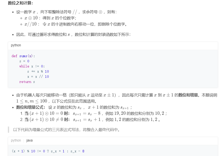地上有一个m行n列的方格,从坐标 [0,0] 到坐标 [m-1,n-1] 。一个机器人从坐标 [0, 0] 的格子开始移动,它每次可以向左、右、上、下移动一格(不能移动到方格外),也不能进入行坐标和列坐标的数位之和大于k的格子。例如,当k为18时,机器人能够进入方格 [35, 37] ,因为3+5+3+7=18。但它不能进入方格 [35, 38],因为3+5+3+8=19。请问该机器人能够到达多少个格子?示例 1: