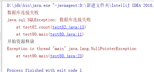 import java.sql.SQLException;public class test80 {//定义了编译异常的方法调用,必须进行显示处理public static void main(String[] args){test82 com=new test82();Connection conn = null;try {double t = com.count( 78, 2, conn );//子类异常必须放在前面}catch (SQLException e){String msg = e.getMessage();System.err.println( msg );e.printStackTrace();//打印异常轨迹}catch (Exception e){String msg = e.getMessage();System.err.println( msg );e.printStackTrace();//打印异常轨迹}finally {//强制执行的代码,通常执行释放被占用的资源System.out.println( "开始资源释放" );try {conn.close();}catch (SQLException e){e.printStackTrace();}System.out.println( "资源释放完毕" );}}