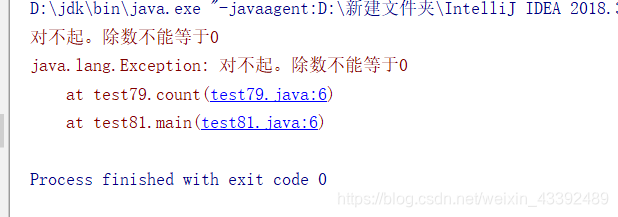 public class test79 {//定义方法声明定义异常,在满足条件时抛出异常对象,程序转向异常处理public double count(double n,double m)throws Exception {if (m == 0) {//如果除数等于0.则抛出异常实例throw  new Exception("对不起。除数不能等于0");}return n/m;}