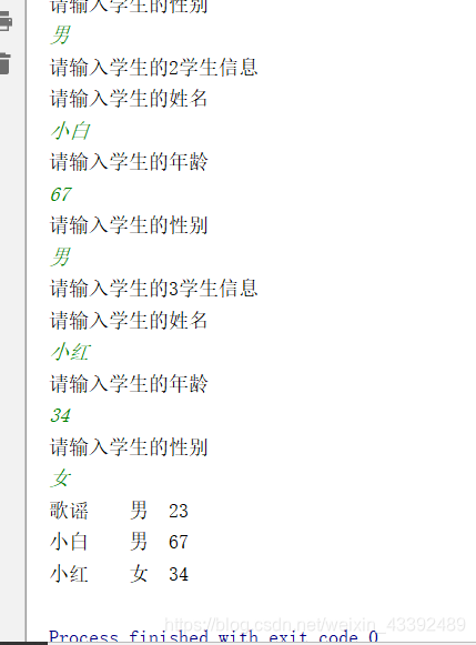 import java.util.*;public class test71 {public static void main(String[] args){Scanner in=new Scanner(System.in);System.out.println("请输入学生的信息");List syuList=new ArrayList();//存储所有学生for(int i=1;i<=3;i++){HashMap stuMap=new HashMap();System.out.println("请输入学生的"+i+"学生信息");System.out.println("请输入学生的姓名");String name=in.next();stuMap.put("name",name);System.out.println("请输入学生的年龄");int age=in.nextInt();stuMap.put("age",age);System.out.println("请输入学生的性别");String sex=in.next();stuMap.put("sex",sex);syuList.add(stuMap);//将学生对象添加到list集合中}for(Object m:syuList) {Map stuMap = (HashMap) m;System.out.println(stuMap.get("name")+"\t"+stuMap.get("sex")+"\t"+stuMap.get("age"));}}
