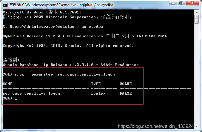 parameter sec_case_sensitive_logon的值为“true”说明区分大小写,为“false”说明不区分大小写,当为“true”时执行以下语句