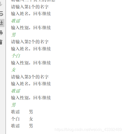 public class test56 {public static void main(String[] args){Scanner in =new Scanner(System.in);ArrayList emps=new ArrayList();System.out.println("请输入三个员工的信息");//从控制台传输数据到list集合中for(int i=0;i<3;i++){test50 emp=new test50();System.out.println("请输入第"+(i+1)+"个的名字");System.out.println("输入姓名,回车继续");String name=in.next();emp.setName(name);System.out.println("输入性别,回车继续");String sex=in.next();emp.setSex(sex);emps.add(emp);}/* 遍历list对象 使用for循环遍历集合*/for(int i=0;i<emps.size();i++){Object obj=emps.get(i);//按照集合元素索引获取集合元素对象test50 emp=(test50)obj;//实现强制转换System.out.println(emp.getName()+"\t"+emp.getSex());}}
