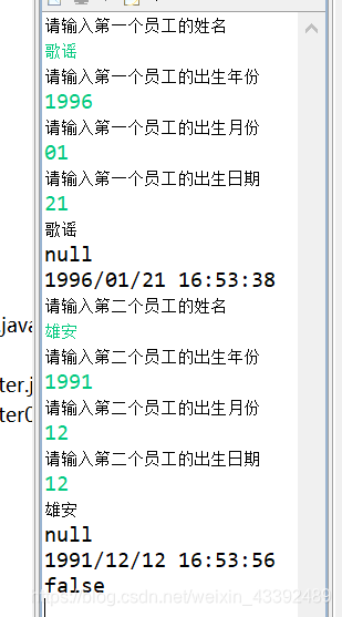 public class test54 {public static void main(String[] args){Scanner in=new Scanner(System.in);test50 emp=new test50();test50 emp1=new test50();System.out.println("请输入第一个员工的姓名");emp.setName(in.next());System.out.println("请输入第一个员工的出生年份");int year=in.nextInt();System.out.println("请输入第一个员工的出生月份");int month=in.nextInt();System.out.println("请输入第一个员工的出生日期");int date=in.nextInt();Calendar cal=Calendar.getInstance();cal.set(Calendar.YEAR,year);cal.set(Calendar.MONTH,month-1);cal.set(Calendar.DATE,date);Date birth=cal.getTime();emp.setBirth(birth);emp.showme();System.out.println("请输入第二个员工的姓名");emp1.setName(in.next());System.out.println("请输入第二个员工的出生年份");int year1=in.nextInt();System.out.println("请输入第二个员工的出生月份");int month1=in.nextInt();System.out.println("请输入第二个员工的出生日期");int date1=in.nextInt();Calendar cal1=Calendar.getInstance();cal1.set(Calendar.YEAR,year1);cal1.set(Calendar.MONTH,month1-1);cal1.set(Calendar.DATE,date1);Date birth1=cal1.getTime();emp1.setBirth(birth1);emp1.showme();System.out.println(cal.before(cal1));}