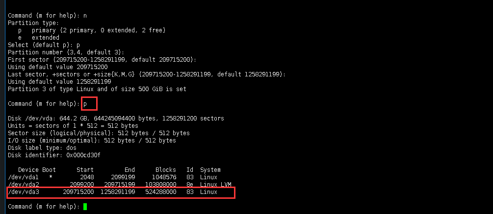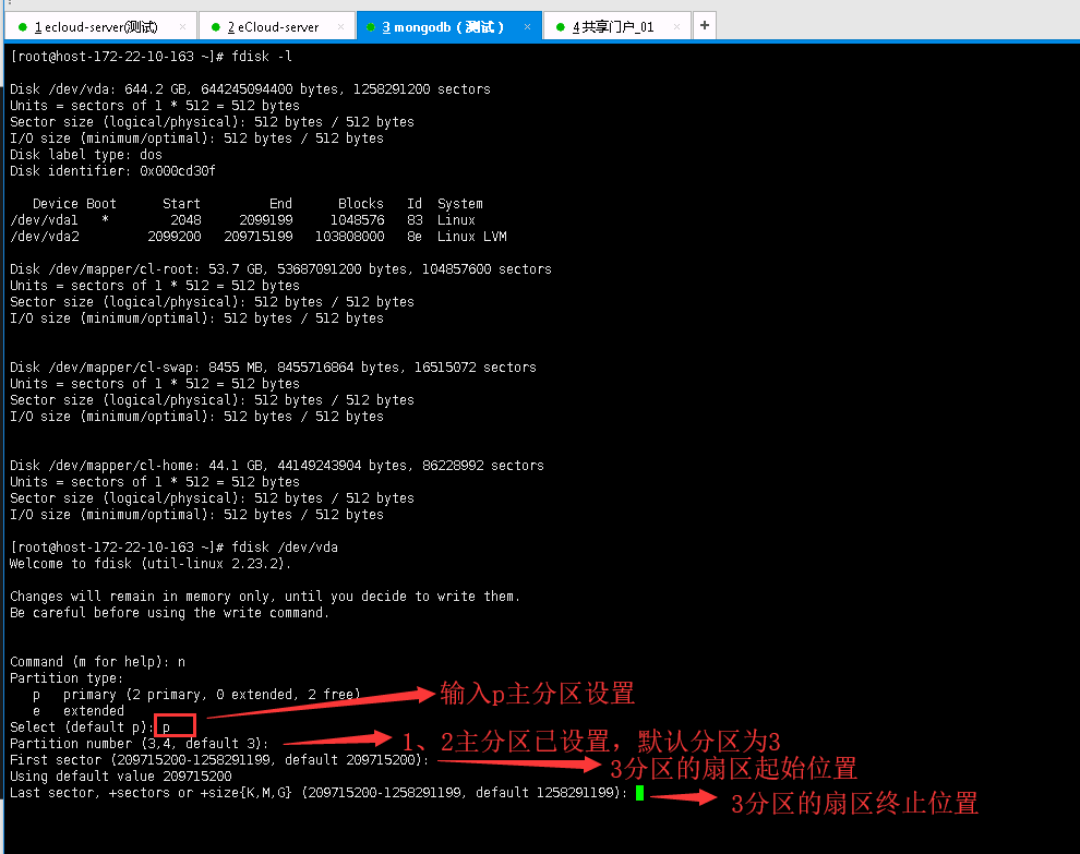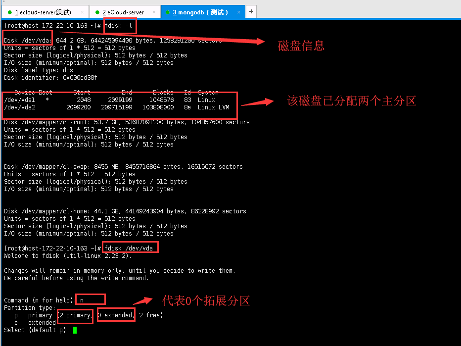 - 服务器开机之后,能自动识别出硬盘,但是硬盘不能够存储数据,必须对硬盘进行分区、格式化、挂载后才能使用;linux主分区和拓展分区总数不能超过4个,拓展分区最多只能有一个;利用fdisk -l命令可以查询到磁盘信息,再fdisk /dev/sda进入分区模式,输入n,可以查看当前磁盘分区情况;截图如下: