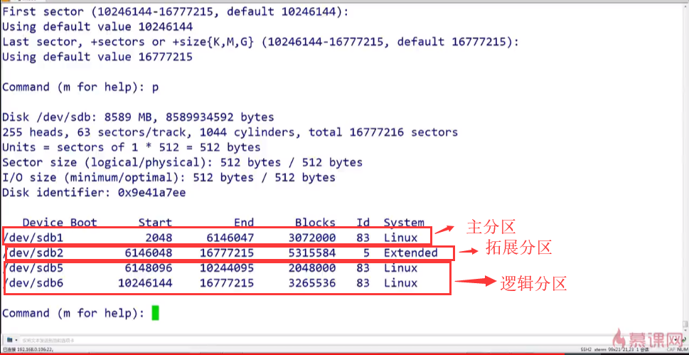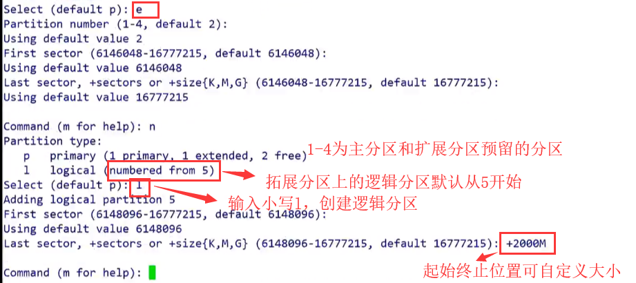 输入e,就为拓展分区,添加扩展分区设置,截图如下: