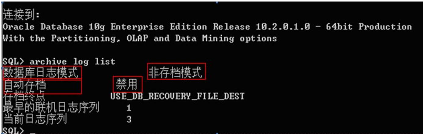 如果“数据库日志模式”为“非存档模式” 按照如下开启归档模式: 提示:使用 sqlplus  /   as  sysdba 方式登录