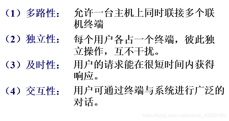- 分时系统——是指在一台主机上连接多个带有显示器和键盘的终端,同时允许多个用户通过自己的终端,以交互方式使用计算机,共享主机中的资源。