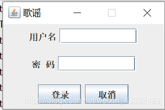 public class test10 extends JFrame {JPanel mb1,mb2,mb3;JButton an1,an2;JLabel bq1,bq2;//标签JTextField wbk;//文本框JPasswordField mmk;//密码框public  static void main(String[] args){test10 lx1=new test10();//主函数调用即可}//定义一个构造器public  test10(){mb1=new JPanel();//默认为流布局mb2=new JPanel();mb3=new JPanel();bq1=new JLabel("用户名");bq2=new JLabel("密  码");an1=new JButton("登录");an2=new JButton("取消");wbk=new JTextField(10);mmk=new JPasswordField(10);//添加组件先把面板上的组件添加,再添加jframe上的组件this.setLayout(new GridLayout(3,1));mb1.add(bq1);mb1.add(wbk);mb2.add(bq2);mb2.add(mmk);mb3.add(an1);mb3.add(an2);this.add(mb1);this.add(mb2);this.add(mb3);//设置标题this.setTitle("歌谣");//设置初始位置this.setLocation(100,100);//设置大小this.setSize(230,150);//释放窗口关闭的资源,这个要写对this.setDefaultCloseOperation(JFrame.EXIT_ON_CLOSE);//显示界面this.setVisible(true);//不可动this.setResizable(false);//1继承jframe类//2在最上方定义组件//3在构造方法中创建组件//4在构造方法添加组件//5设置窗体属性//6显示窗体//7在主函数创建对象}