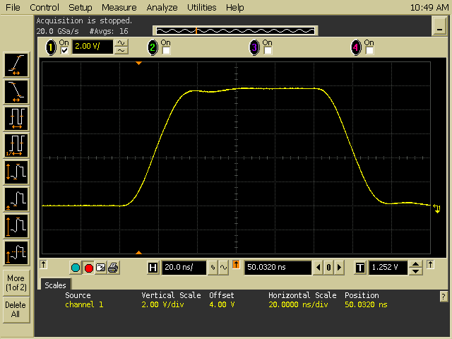 如此好的精度,带来的直接好处,就是脉冲建立时,overshoot和振铃都非常小,来看几种电压和建立时间的组合: