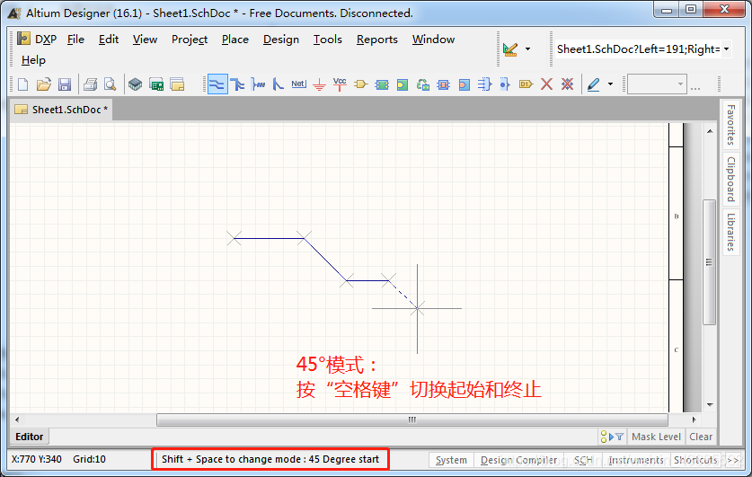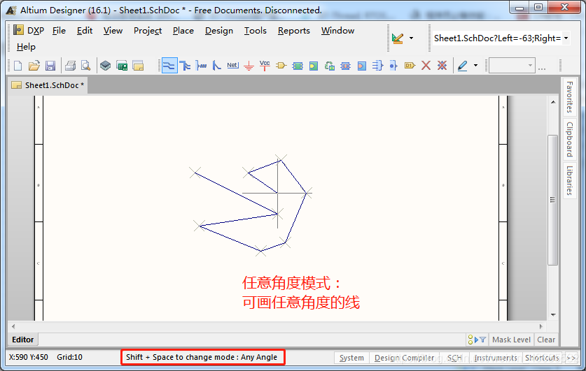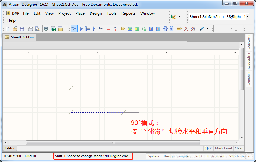 在绘图界面选择画线后,使用“shift+空格”可切换不同的画线模式。切换过程中会有90°模式、45度模式、任意角度模式等,在这些模式中可使用空格键在进行细分切换。