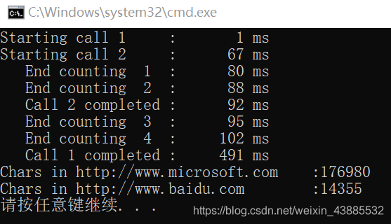 {class MyDownloadString{Stopwatch sw = new Stopwatch();private async Task<int> CountCharactersAsyc(int id, string uriString){WebClient wc1 = new WebClient();Console.WriteLine("Starting call {0} : {1, 4:N0} ms", id, sw.Elapsed.TotalMilliseconds);string result = await wc1.DownloadStringTaskAsync(new Uri(uriString));Console.WriteLine(" Call {0} completed : {1, 4:N0} ms", id, sw.Elapsed.TotalMilliseconds);return result.Length;}private void CountToALargeNumber(int id, int value){for (long i = 0; i < value; i++){}Console.WriteLine(" End counting {0} : {1, 4:N0} ms", id, sw.Elapsed.TotalMilliseconds);}public void DoRun(){const int largeNumber = 6000000;const string microsoft = "http://www.microsoft.com";const string baidu = "http://www.baidu.com";sw.Start();Task<int> t1 = CountCharactersAsyc(1, microsoft);Task<int> t2 = CountCharactersAsyc(2, baidu);CountToALargeNumber(1, largeNumber);CountToALargeNumber(2, largeNumber);CountToALargeNumber(3, largeNumber);CountToALargeNumber(4, largeNumber);Console.WriteLine("Chars in {0} :{1}", microsoft, t1.Result);Console.WriteLine("Chars in {0} :{1}", baidu, t1.Result);}}class Program{static void Main(string[] args){MyDownloadString mds = new MyDownloadString();mds.DoRun();}}}