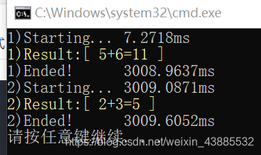 {static class DoAsyncStuff{private static int GetSum(int i1, int i2){Thread.Sleep(3000);return i1 + i2;}public static async Task<int> CalculateSumAsync(int i1, int i2){int sum = await Task.Run(() => GetSum(i1, i2));return sum;}}class Program{static void Main(string[] args){Stopwatch sw = new Stopwatch();ConsoleColor color = Console.ForegroundColor;sw.Start();int a1 = 5;int a2 = 6;int a3 = 2;int a4 = 3;Task<int> value = DoAsyncStuff.CalculateSumAsync(a1, a2);Task<int> value2 = DoAsyncStuff.CalculateSumAsync(a3, a4);Console.WriteLine("1)Starting... {0}ms", sw.Elapsed.TotalMilliseconds);Console.ForegroundColor = ConsoleColor.Yellow;Console.WriteLine("1)Result:[ {0}+{1}={2} ]", a1, a2, value.Result);Console.ForegroundColor = color;Console.WriteLine("1)Ended! {0}ms", sw.Elapsed.TotalMilliseconds);Console.WriteLine("2)Starting... {0}ms", sw.Elapsed.TotalMilliseconds);Console.ForegroundColor = ConsoleColor.Yellow;Console.WriteLine("2)Result:[ {0}+{1}={2} ]", a3, a4, value2.Result);Console.ForegroundColor = color;Console.WriteLine("2)Ended! {0}ms", sw.Elapsed.TotalMilliseconds);sw.Stop();}}}