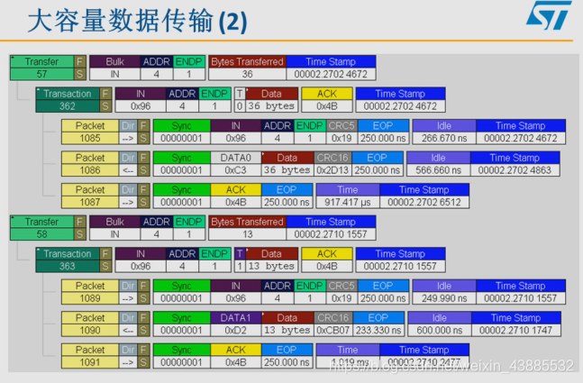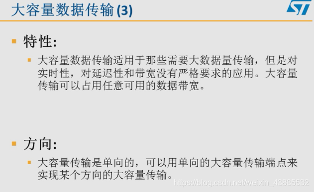 大容量传输对实时性没有太高要求,对延迟有较大的容忍,且在协议层面并未规定最大的容忍延迟时间,但能从协议层面保证数据传输的正确性和完整性。