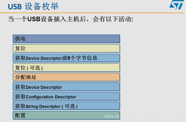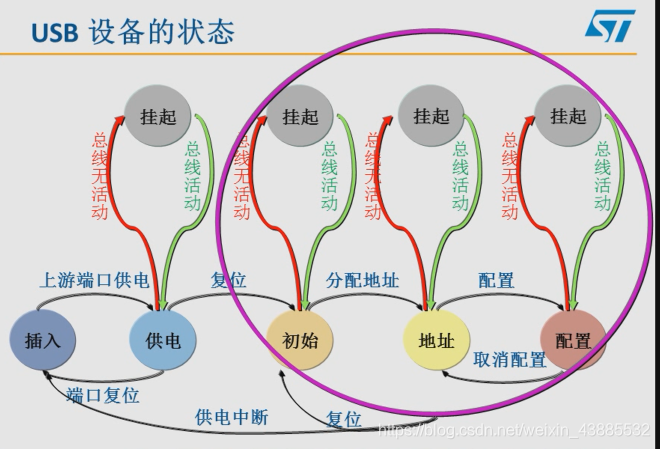 从供电状态开始,在任何状态下,只要设备检测到3mS内USB总线上没有活动就会进入挂起状态。当检测到USB总线上的活动恢复时,设备又会恢复到挂起状态之前的状态。