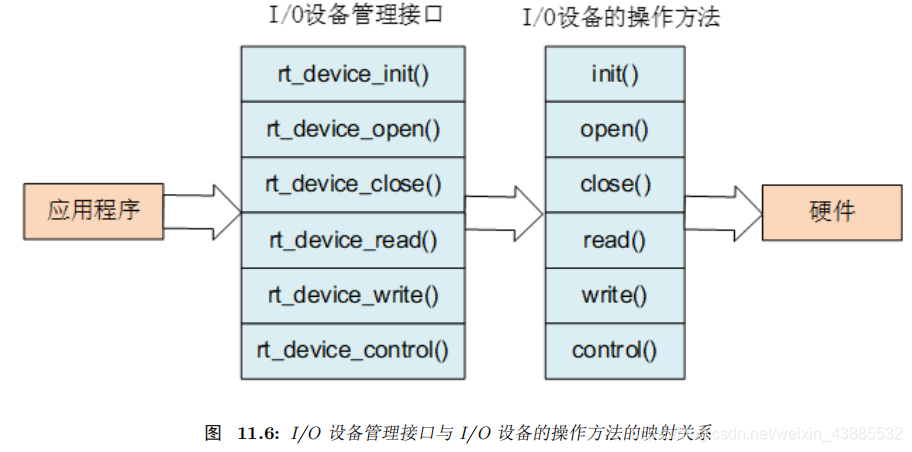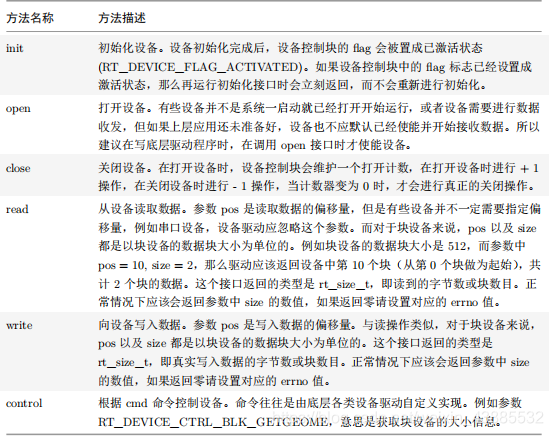 {/* common device interface */rt_err_t (*init) (rt_device_t dev);rt_err_t (*open) (rt_device_t dev, rt_uint16_t oflag);rt_err_t (*close) (rt_device_t dev);rt_size_t (*read) (rt_device_t dev, rt_off_t pos, void *buffer, rt_size_t size);rt_size_t (*write) (rt_device_t dev, rt_off_t pos, const void *buffer, rt_size_t size);rt_err_t (*control)(rt_device_t dev, int cmd, void *args);