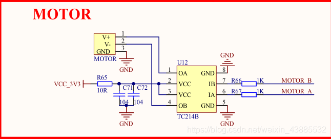 STM32控制电机的引脚为MOTOR_A(PA0)、MOTOR_B(PA1),通过TIM2_CH1和TIM2_CH2产生两路PWM信号控制TC214B,从而实现直流电机的转动控制。