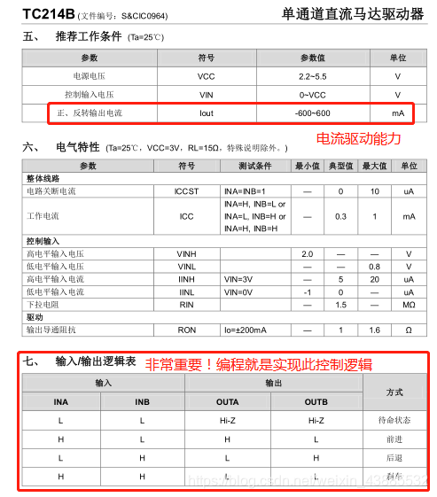 根据TC214B芯片手册的“八、输入/输出波形”可知,当INA为高,INB为低时电机前进,当INA为低,INB为高时电机后退。因此电机控制逻辑可以按照如下实现: