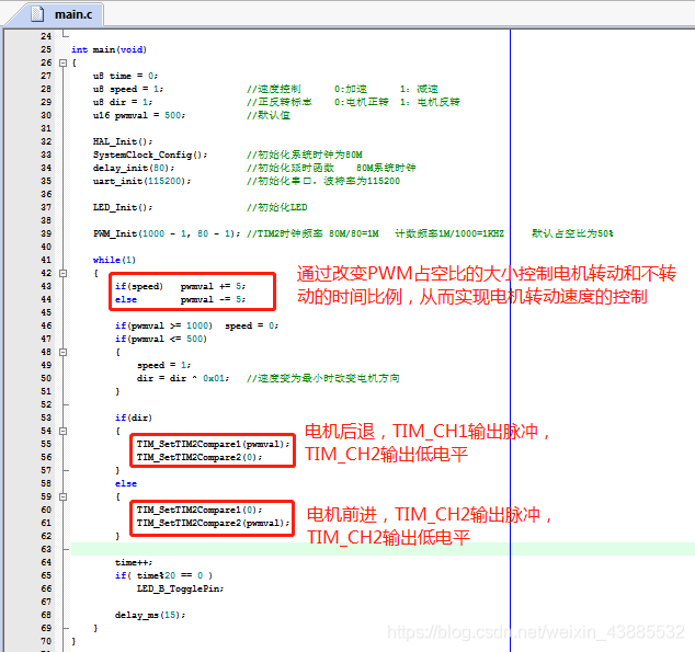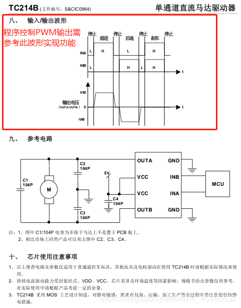 通过以上资料可以了解到,MCU控制TC214B从而进行直流电机转动方向,方向控制(即前进/后退)主要是通过控制MCU输出两路PWM在同一时刻的高低电平决定,速度控制主要是通过PWM输出脉冲的占空比决定。