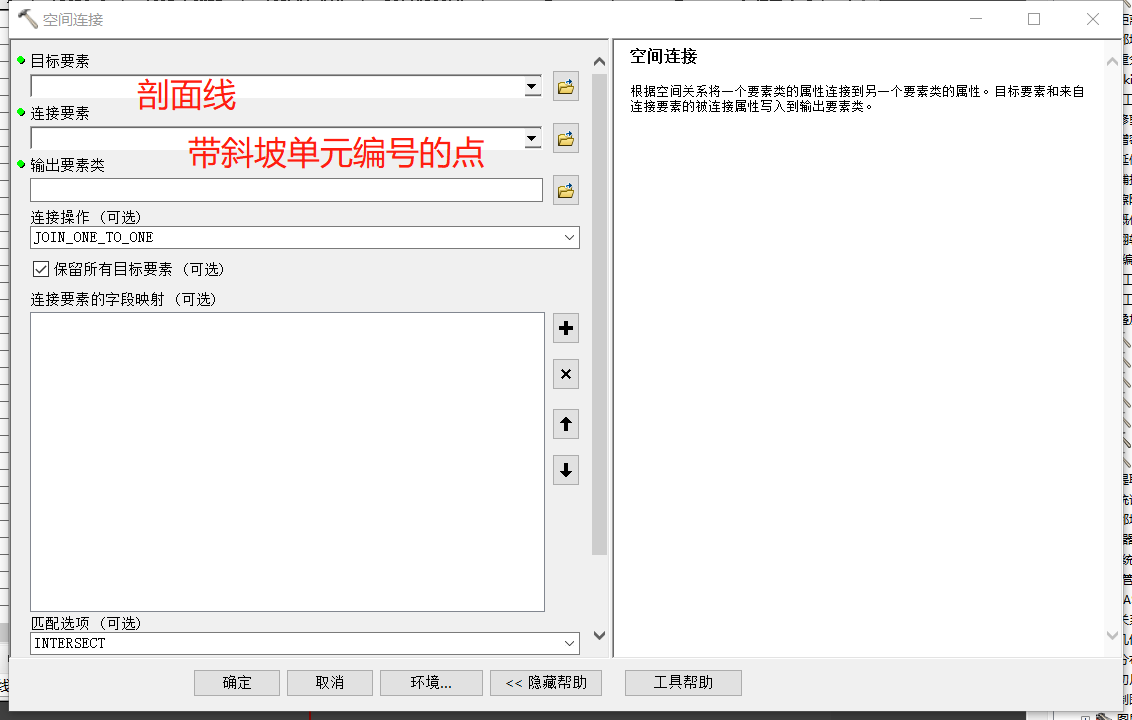 由于创建完的剖面线不带有野外编号,所以我们需要进行空间连接,因为斜坡单元转点后的数据是具有编号,所以进行空间连接将斜坡编号赋值给剖面线
