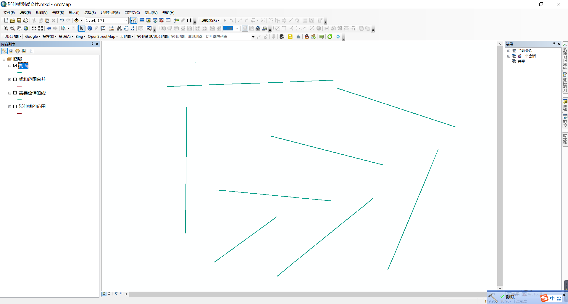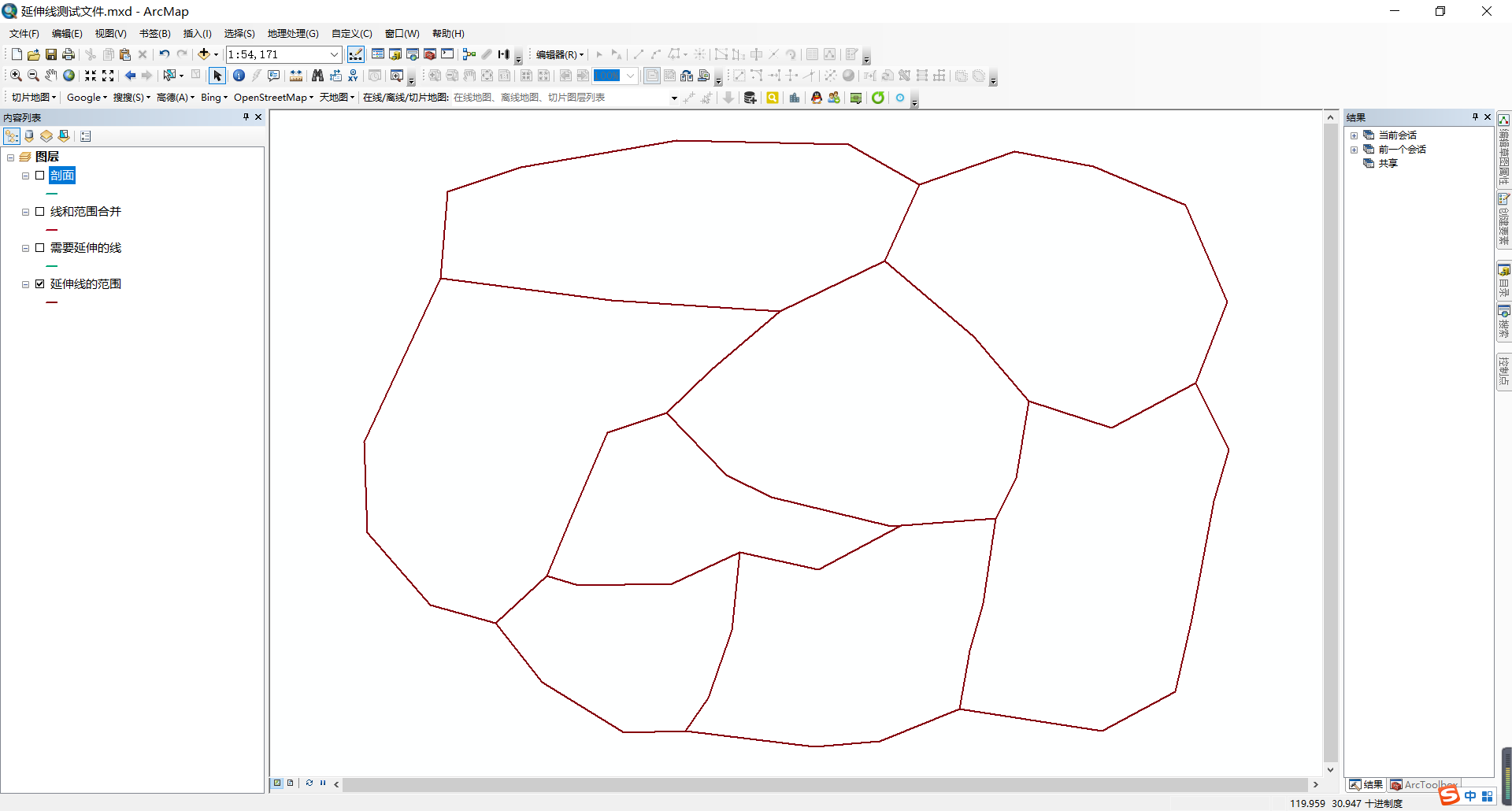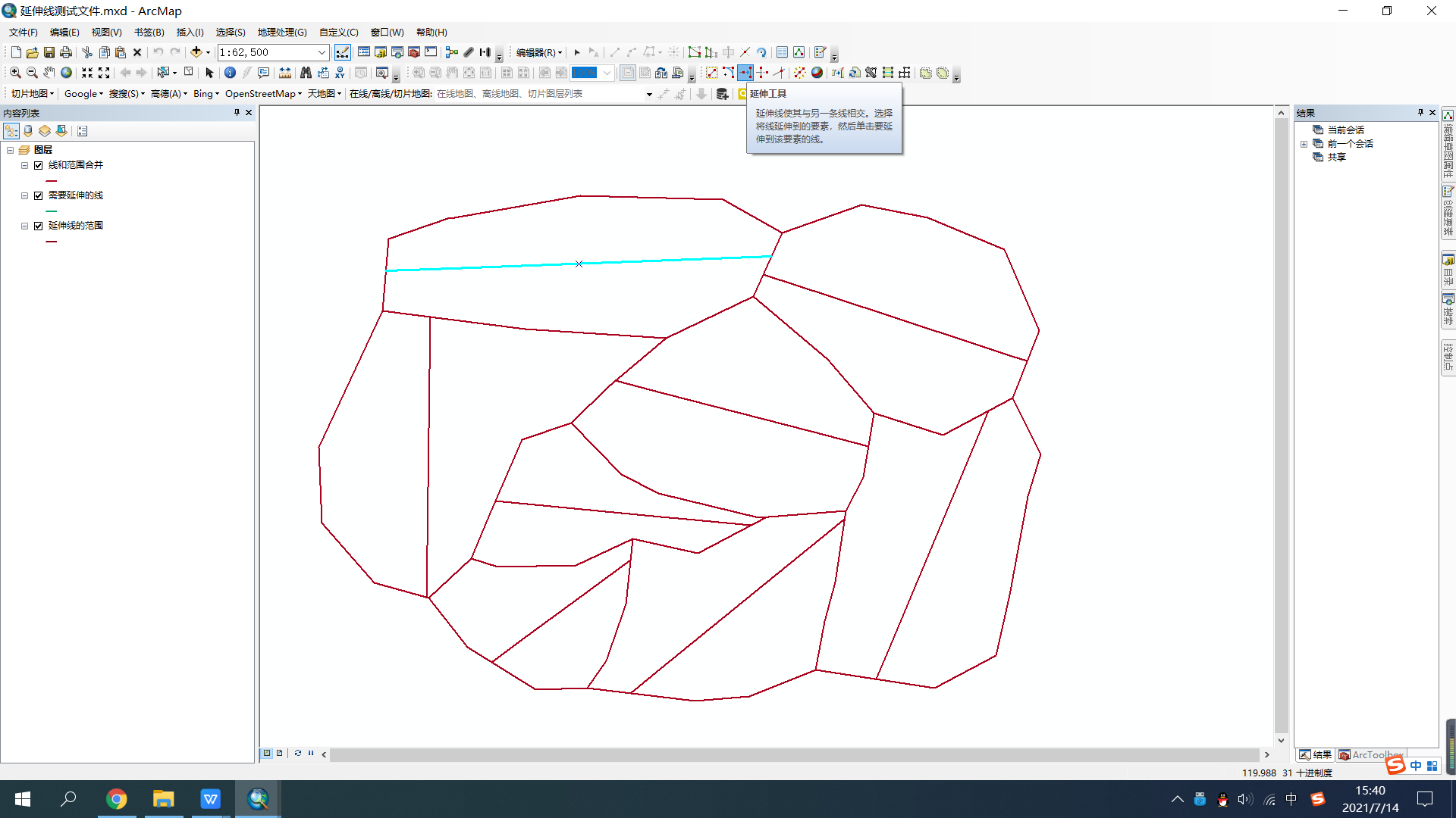 6.将线进行延伸(该过程花费时间较长(毕竟计算机需要识别边界线没有人工快一些),读者可以开启编辑进行延伸,相对来说花费时间少,准确度高一些)(个人建议数据量小的时候可以使用该用具,数据量大的时候不建议使用)