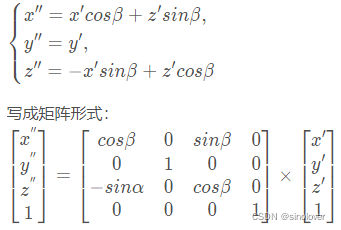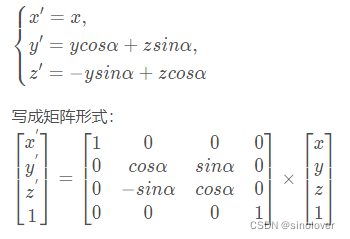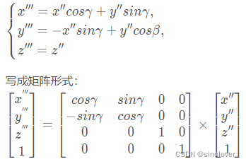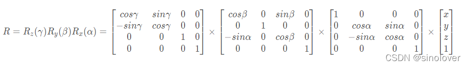 所以,坐标轴分别依次绕x,y,z轴旋转α \alphaα,β \betaβ,γ \gammaγ的变换矩阵(前后用左乘来连接):