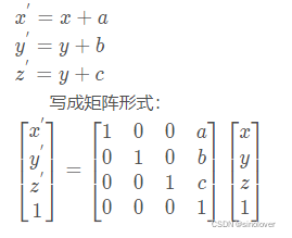中间4x4的矩阵叫变换矩阵。可见,如果要平移坐标,要将坐标维度增加1,变成齐次坐标(齐次坐标(homogeneous coordinates)就是将一个原本是n维的向量用一个n+1维向量来表示,常用于投影几何)。
