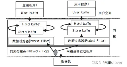 the network tap和the packet filter。the network tap收集来自网络设备驱动的包的一个拷贝,并把它专递给监听程序。the packet filter决定是否接收这个包并且把它拷贝给监听程序 -