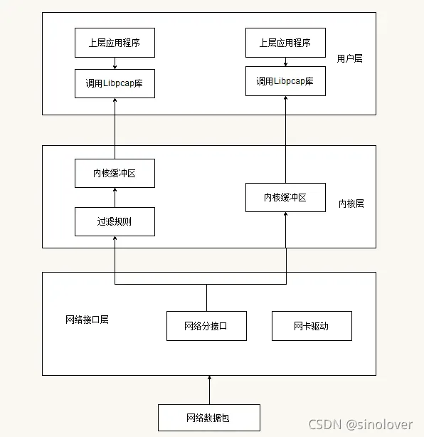 这里实现的包捕获机制是在数据链路层增加一个旁路处理,并不干扰系统自身的网路协议栈的处理,对发送和接收的数据包通过Linux内核做过滤和缓冲处理,最后直接传递给上层应用程序。因此libpcap在捕获到达网卡的数据包后绕开了传统linux协议栈处理,直接使用链路层PF_PACKET协议族原始套接字方式向用户空间传递报文。
